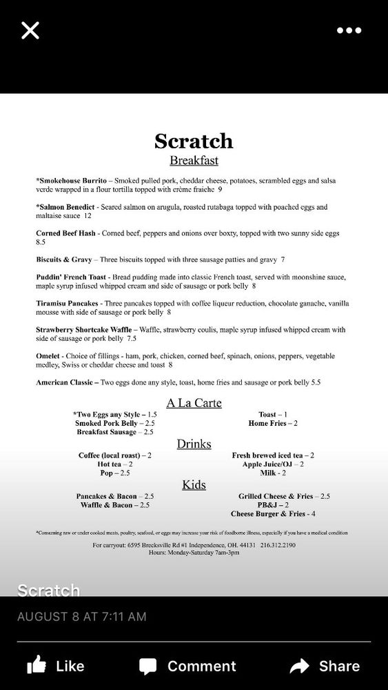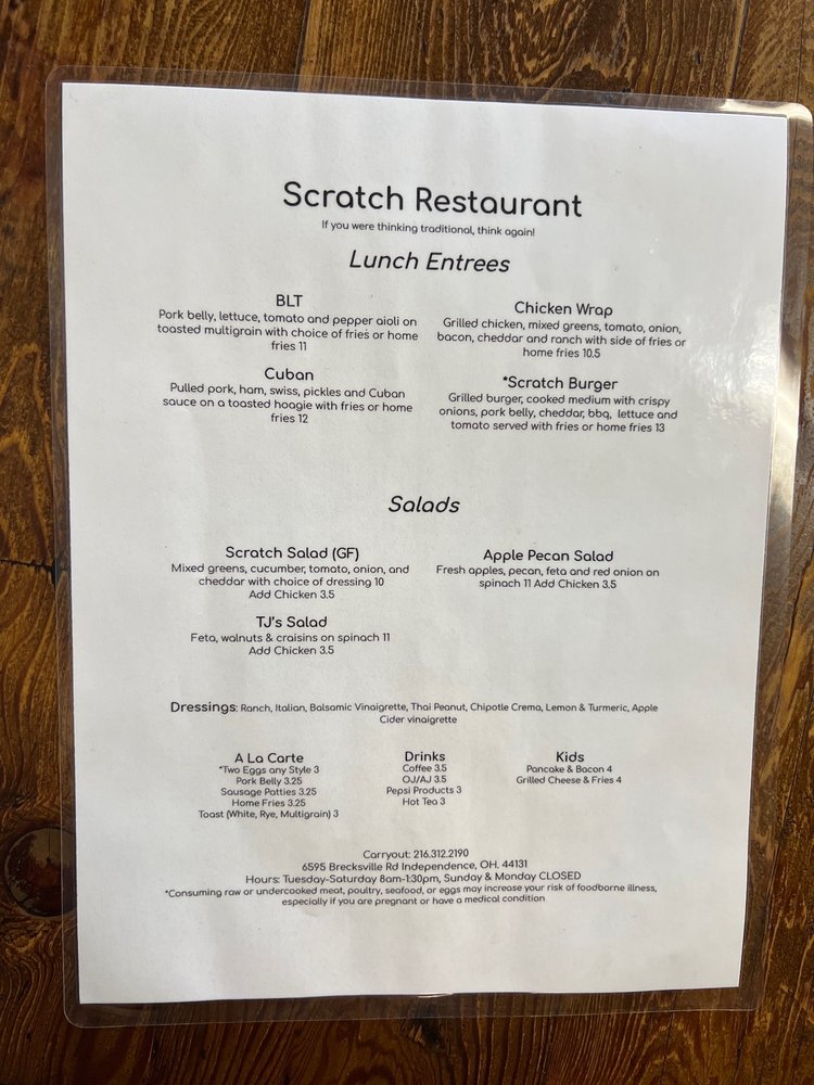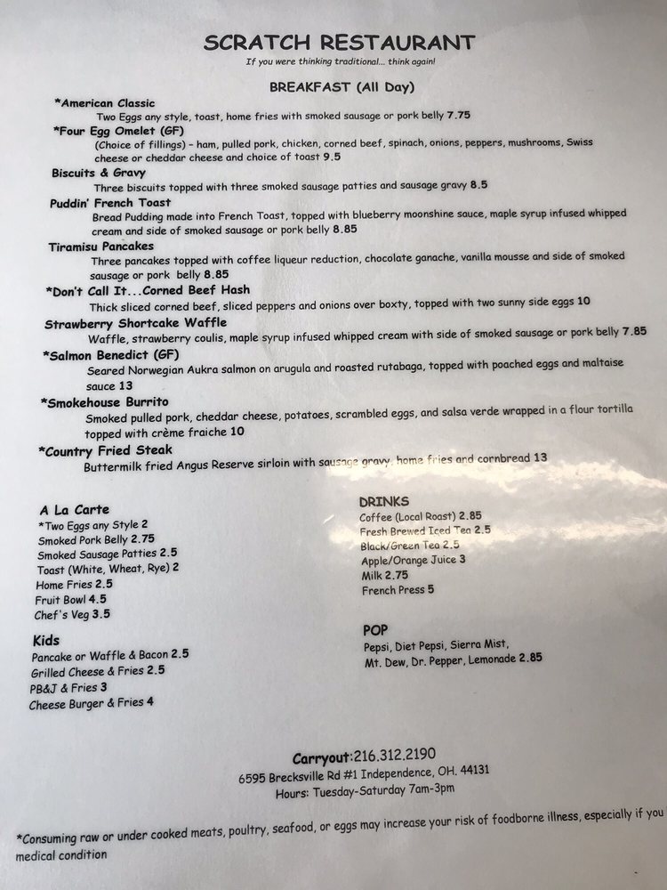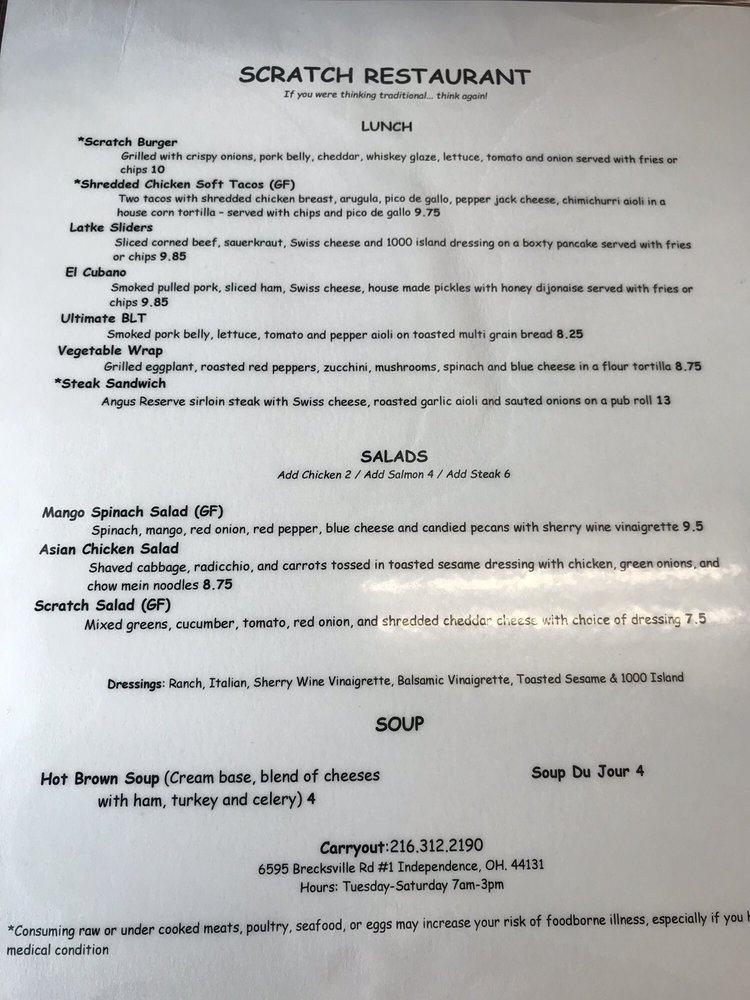 Introducing Scratch, a popular American salad and breakfast & brunch spot located at 6595 Brecksville Rd Ste 1 Independence, OH 44131. This casual restaurant offers a wide range of amenities, including delivery, takeout, and catering services. Scratch is wheelchair accessible and accepts various payment methods, including credit cards, cryptocurrency, Android Pay, and Apple Pay. The menu is kid-friendly and perfect for groups, with options for both breakfast and lunch. Not to mention, Scratch offers a military discount and has free Wi-Fi for customers. The atmosphere is welcoming and moderate in noise level, making it a great spot for a meal with friends or family. From fresh salads to hearty brunch options, Scratch has something for everyone to enjoy. Don't miss out on the delicious dishes and cozy dining experience at Scratch!