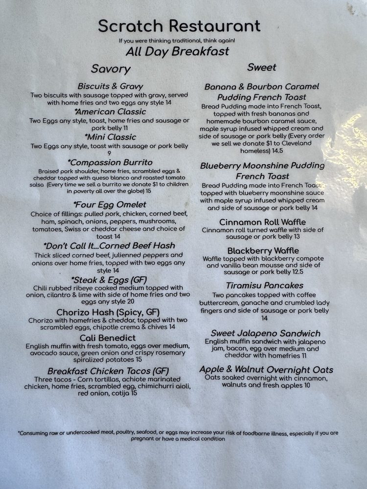 Bread Pudding made into French Toast, topped with fresh bananas and homemade bourbon caramel sauce, maple syrup infused whipped cream and side of sausage or pork belly (Every order we sell we donate $ to Cleveland homeless)